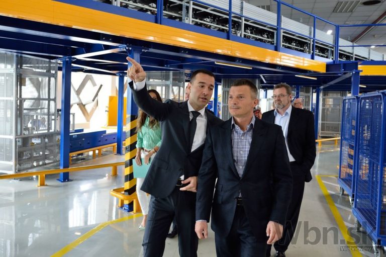 Sprava v strede: Generálny riaditeľ Slovenskej pošty Tomáš Drucker a minister dopravy, výstavby a regionálneho rozvoja SR Ján Počiatek počas slávnostného spustenia novej balíkovej triediacej linky Slovenskej pošty na Tomášikovej ulici v Bratislave. Bratislava 16.jún 2015. Foto: SITA/Robert Tappert