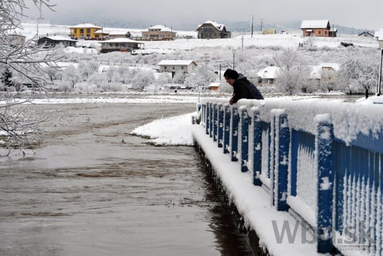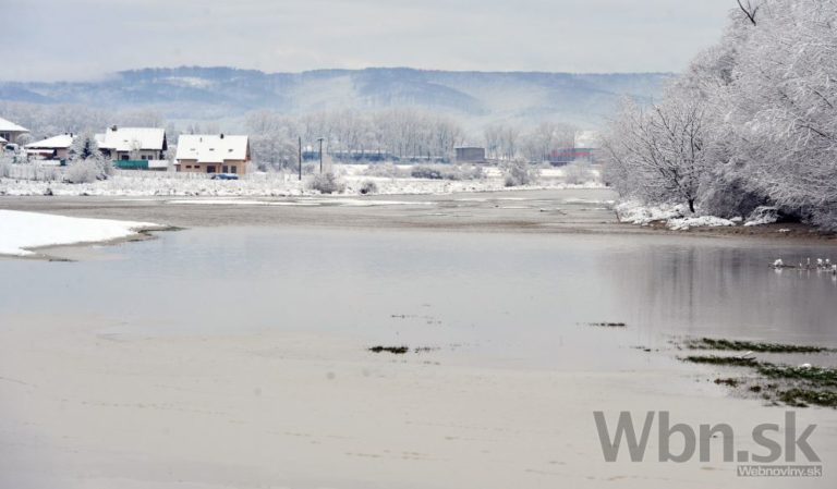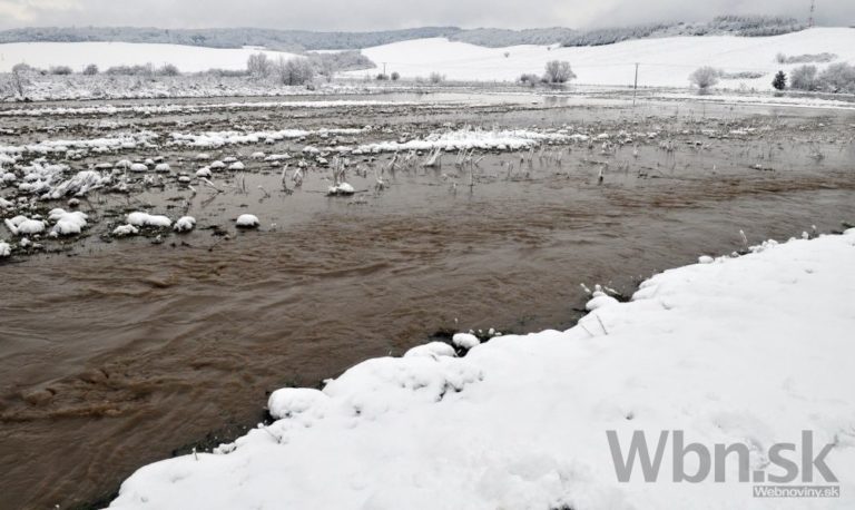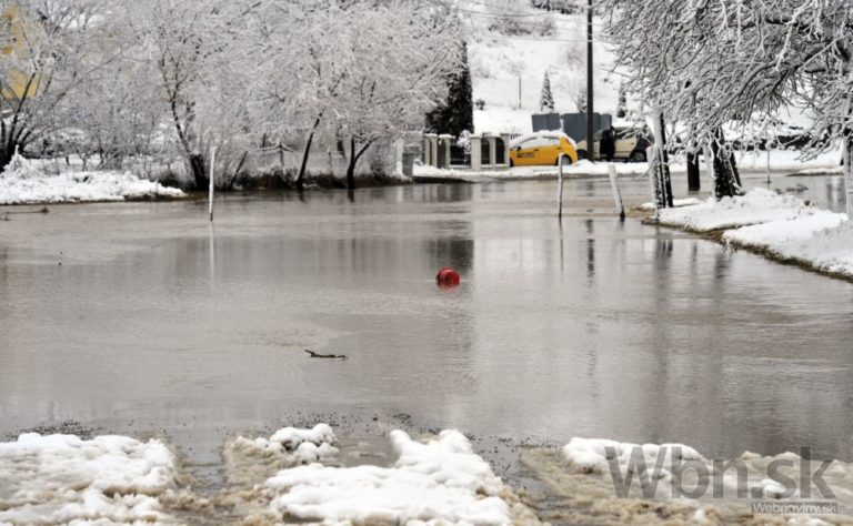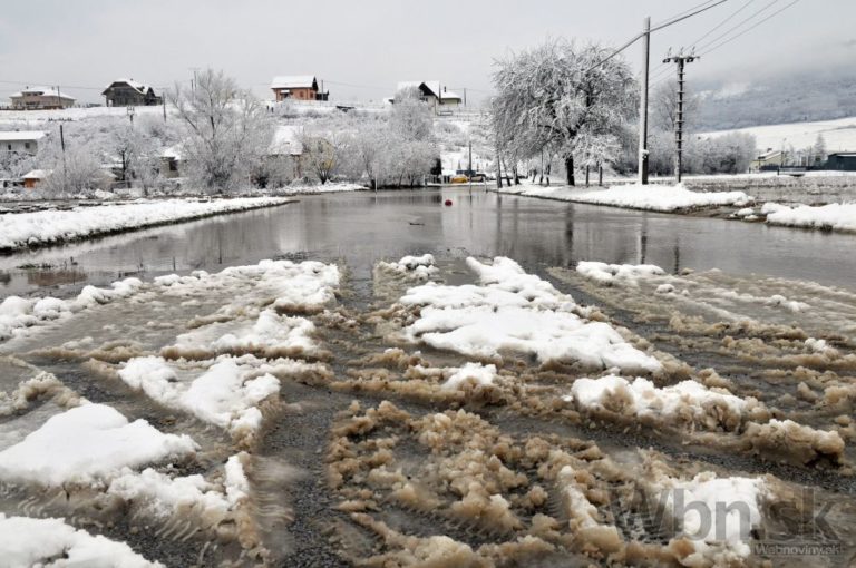 Výdatné sneženie a následne topiaci sa sneh spôsobili vyliatie potoka Sekčov pri Finticiach. Cesta bola neprejazdná. Fintice, 31. január 2015. Foto: SITA/Viktor Zamborský