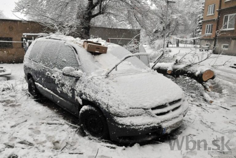 Ťažký sneh v Prešove na Pavlovičovom námesti spôsobil vyvrátenie stromu, ktorý zničil pod ním stojacie auto. Prešov, 31. január 2015. Foto: SITA/Viktor Zamborský