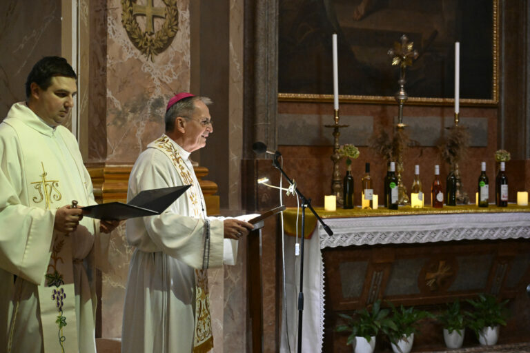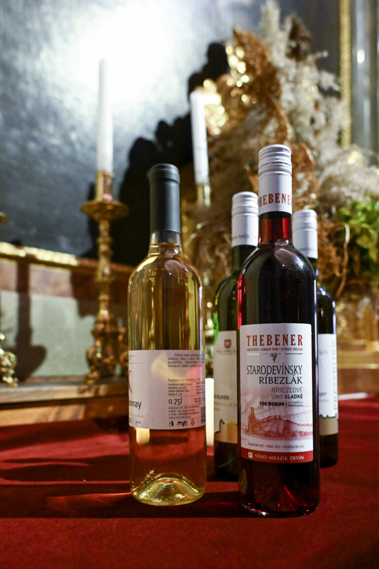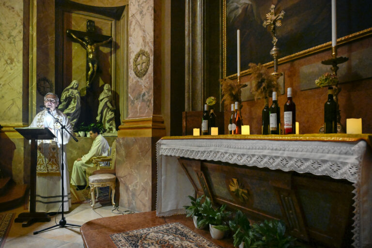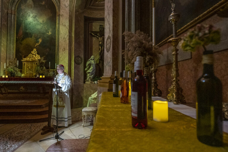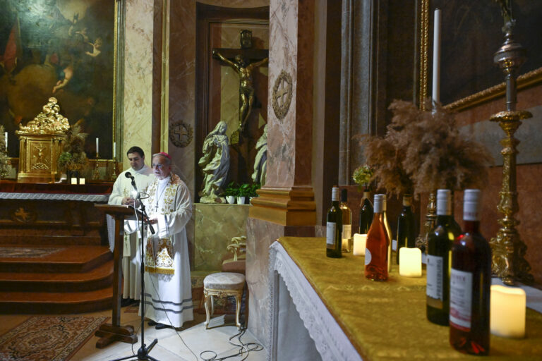 Cirkevný hodnostár, bratislavský arcibiskup Stanislav Zvolenský (v pozadí vpravo) počas požehnania vína z tohtoročnej úrody v Kaplnke sv. Ladislava v Primaciálnom paláci. Bratislava, 8. november 2024. Foto: SITA/Milan Illík