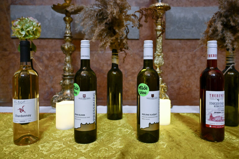 Cirkevný hodnostár, bratislavský arcibiskup Stanislav Zvolenský (druhý sprava), viceprimátorka Bratislavy Tatiana Kratochvílová (vpravo) a viceprimátor hlavného mesta SR Bratislavy Jakub Mrva (druhý sprava) počas požehnania vína z tohtoročnej úrody v Kaplnke sv. Ladislava v Primaciálnom paláci. Bratislava, 8. november 2024. Foto: SITA/Milan Illík