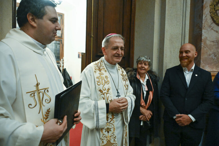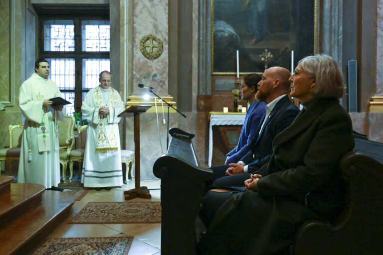 Cirkevný hodnostár, bratislavský arcibiskup Stanislav Zvolenský (druhý zľava), viceprimátorka Bratislavy Tatiana Kratochvílová (vpravo v popredí) a viceprimátor hlavného mesta SR Bratislavy Jakub Mrva (druhý sprava vpopredí) počas požehnania vína z tohtoročnej úrody v Kaplnke sv. Ladislava v Primaciálnom paláci. Bratislava, 8. november 2024. Foto: SITA/Milan Illík