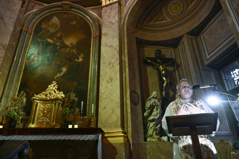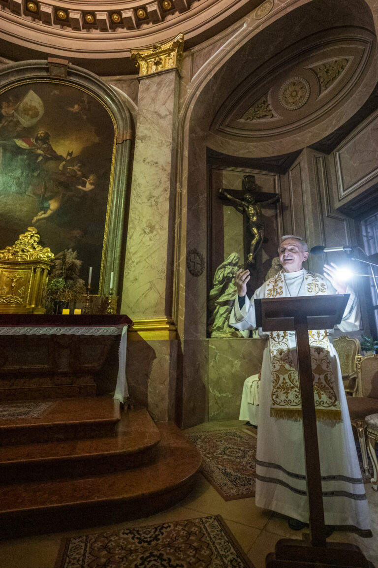 Cirkevný hodnostár, bratislavský arcibiskup Stanislav Zvolenský počas požehnania vína z tohtoročnej úrody v Kaplnke sv. Ladislava v Primaciálnom paláci. Bratislava, 8. november 2024. Foto: SITA/Milan Illík