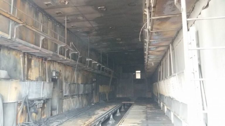 Lakovňa po požiari v areáli spoločnosti ŽOS na Koniarekovej ulici v Trnave. Majiteľovi vznikla priama materiálna škoda predbežne vyčíslená na 200-tisíc eur. Na miesto udalosti bol vyslaný aj zisťovateľ príčin požiaru z Požiarnotechnického a expertízneho ústavu ministerstva vnútra v Bratislave. Trnava, 23. máj 2017. Foto: SITA/KR HaZZ Trnava