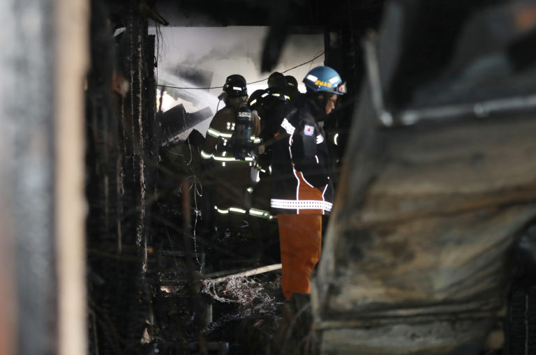 Požiar v nemocnici v juhokórejskom meste Mirjang si vyžiadal. Oheň vypukol na pohotovosti na prvom poschodí a hasičom sa ho podarilo uhasiť po takmer troch hodinách. Väčšinu úmrtí spôsobila inhalácia dymu. Mirjang, 26. január 2018. Foto: Kim Gu Yeon/Gyeongnam Domin Ilbo via AP.