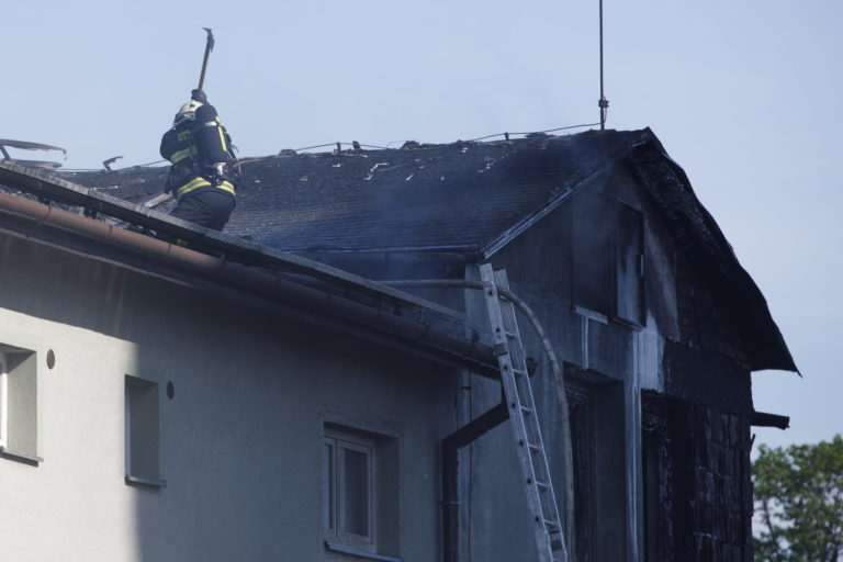 Hasič zasahuje pri požiari dvoch skladov s pneumatikami a priľahlej dvojpodlažnej budovy v bratislavských Podunajských Biskupiciach v blízkosti Kazanskej ulice. Bratislava, 10. máj 2021. Foto: SITA/Branislav Bibel
