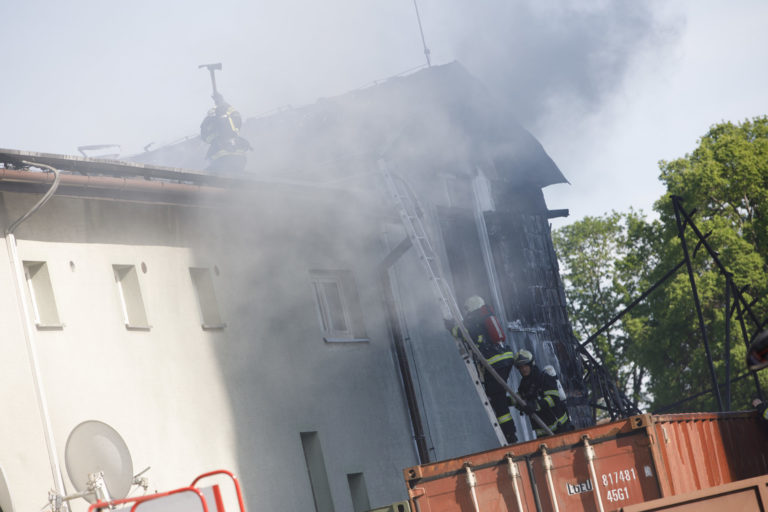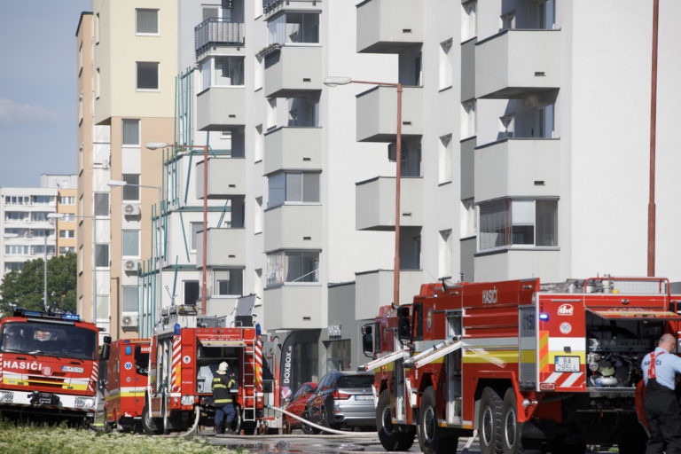 Hasiči zasahujú pri požiari dvoch skladov s pneumatikami a priľahlej dvojpodlažnej budovy v bratislavských Podunajských Biskupiciach v blízkosti Kazanskej ulice. Bratislava, 10. máj 2021. Foto: SITA/Branislav Bibel