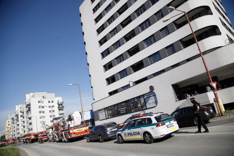 Požiarnici a polícia zasahujú pri požiari dvoch skladov s pneumatikami a priľahlej dvojpodlažnej budovy v bratislavských Podunajských Biskupiciach v blízkosti Kazanskej ulice. Bratislava, 10. máj 2021. Foto: SITA/Branislav Bibel