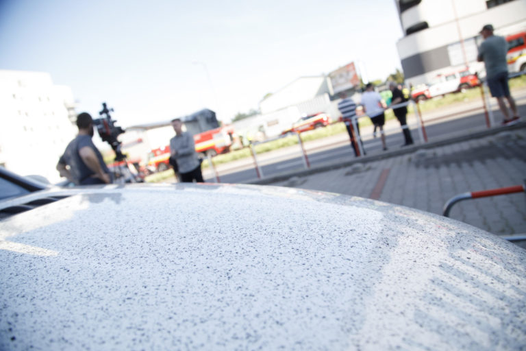 Popol na kapote auta po požiari dvoch skladov s pneumatikami a priľahlej dvojpodlažnej budovy v bratislavských Podunajských Biskupiciach v blízkosti Kazanskej ulice. Bratislava, 10. máj 2021. Foto: SITA/Branislav Bibel