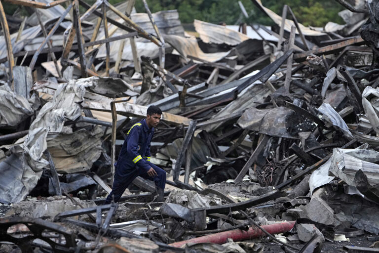 Hasič sa pohybuje medzi zhorenými troskami deň po vypuknutí požiaru v zábavnom parku v indickom meste Rajkot v nedeľu 26. mája 2024. Foto: SITA/AP