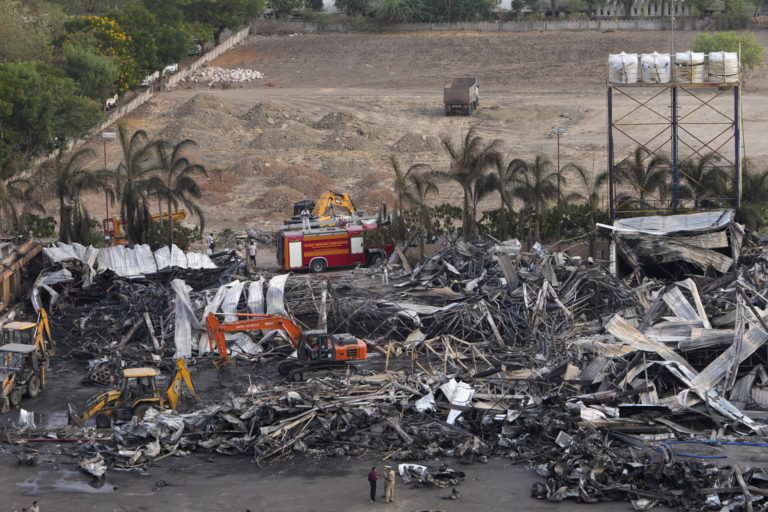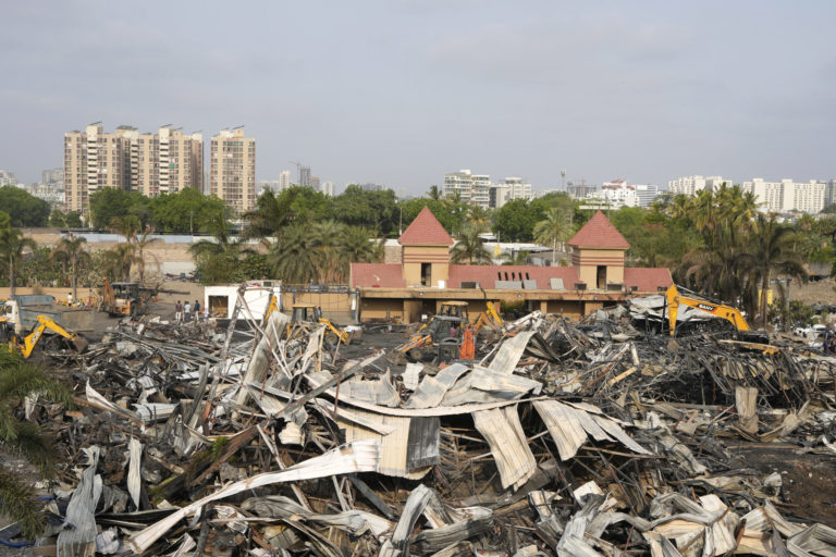 Zemné práce odstraňujú zhorené trosky deň po požiari, ktorý vypukol v zábavnom parku v indickom meste Rajkot v nedeľu 26. mája 2024. Foto: SITA/AP