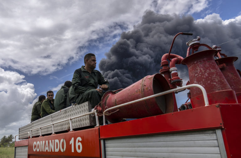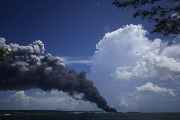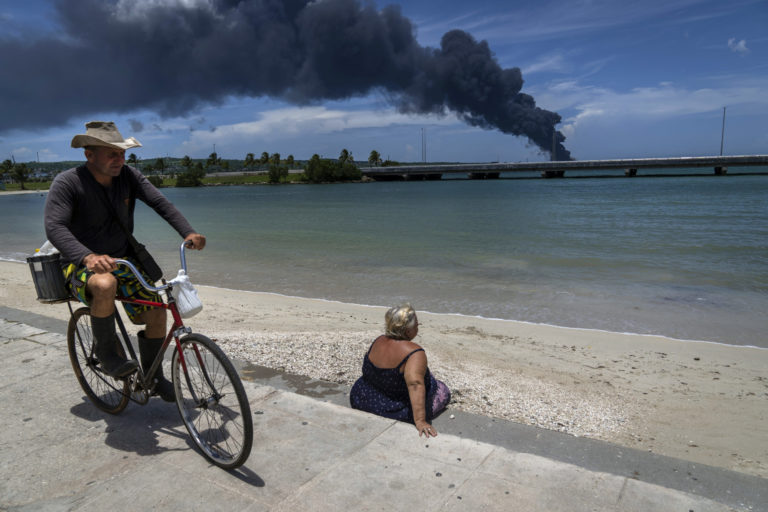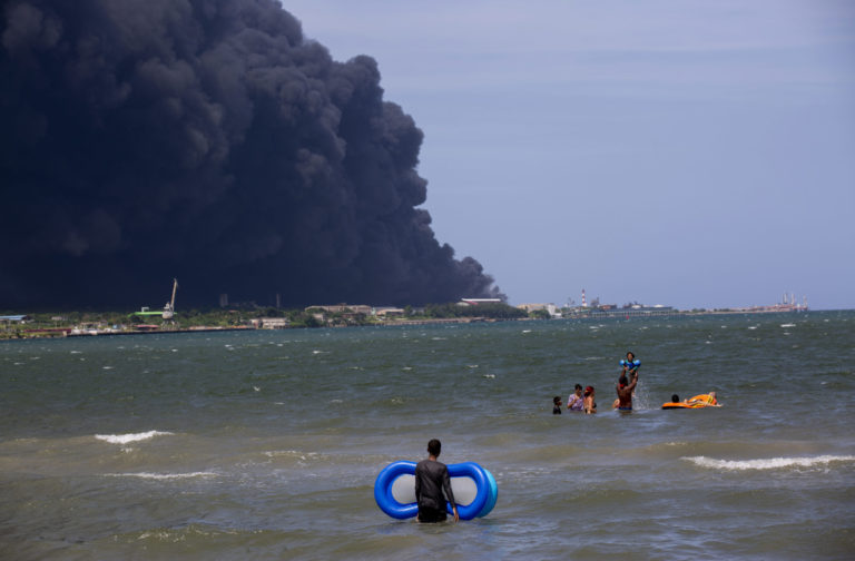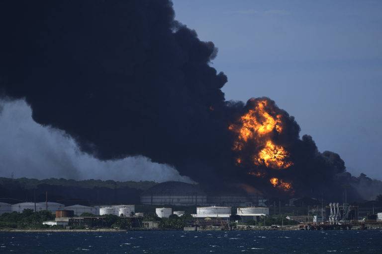 Plamene a dym z horiacich zásobníkov ropy na Kube vidno už z diaľky. Foto: SITA/AP