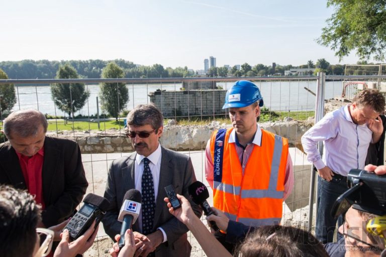 Sprava: Generálny riaditeľ Eurovia.sk Róbert Šinály a primátor Bratislavy Milan Ftáčnik na brífingu v súvislosti s obnovením stavebných prác na rekonštrukcii Starého mosta. Bratislava, 18. september 2014. Foto: SITA/Jozef Jakubčo