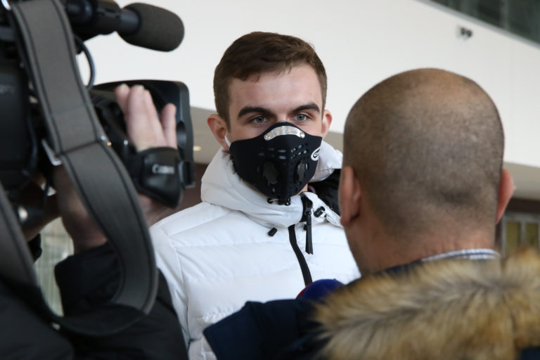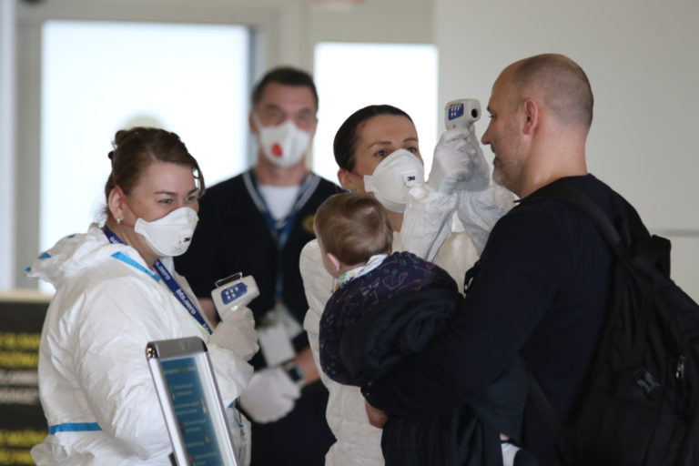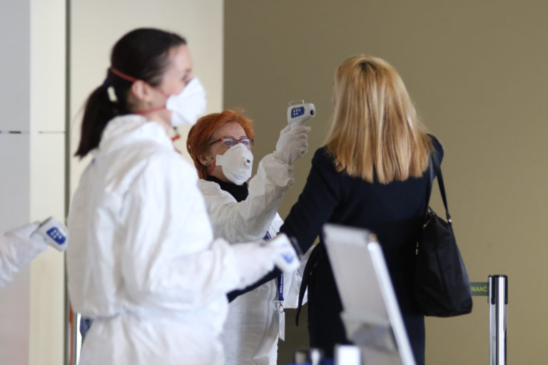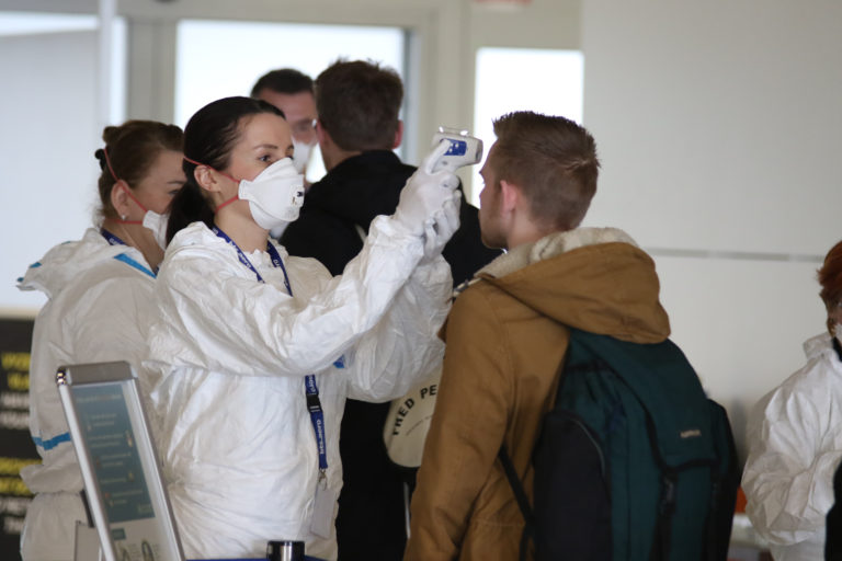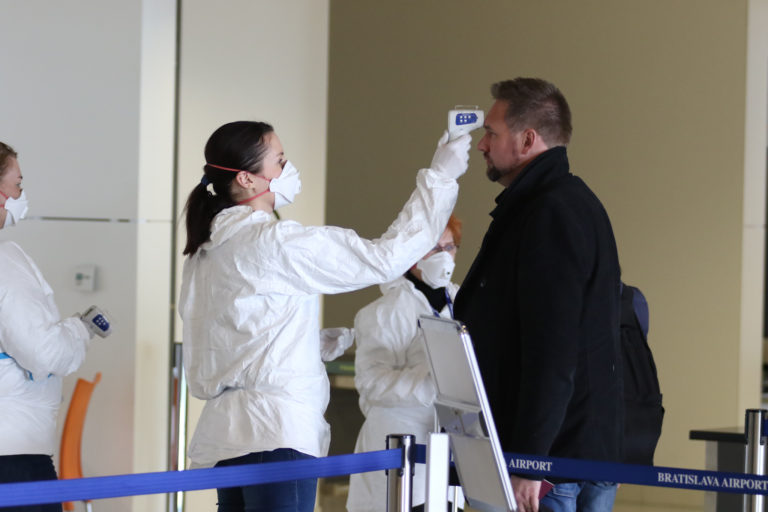 Hygienici rezortu dopravy merajú teplotu cestujúcemu na bratislavskom letisku v súvislosti so zavedením preventívnych opatrení v dôsledku šírenia koronavírusu (COVID-19) vo svete cestujúcich, ktorí prilietajú do Bratislavy Foto: SITA/Alexandra Čunderlíková