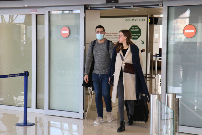 cestujúci prilietajú do Bratislavy, v rámci preventívnych opatrení sa chránia rúškami Foto: SITA/Alexandra Čunderlíková