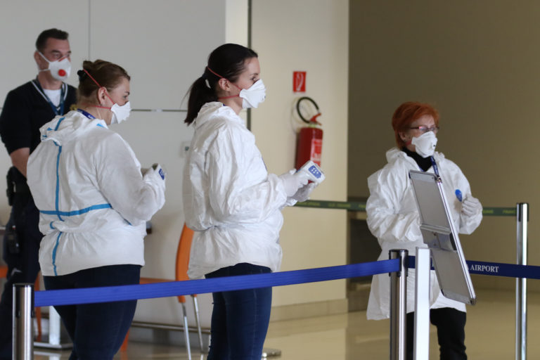 Hygienici čakajú na prichádzajúcich cestujúcich na bratislavskom letisku počas kontroly v súvislosti so zavedením preventívnych opatrení v dôsledku šírenia koronavírusu (COVID-19) Foto: SITA/Alexandra Čunderlíková