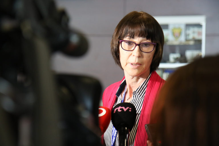 Riaditeľka útvaru vedúceho hygienika Katarína Chudíková počas brífingu v rámci kontroly postupov a práce hygienikov rezortu dopravy v príletovej hale na Letisku M. R. Štefánika Foto: SITA/Alexandra Čunderlíková