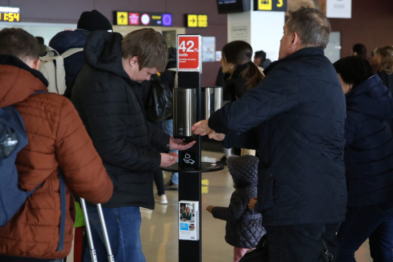 Cestujúci si dezinfikujú ruky počas kontroly v príletovej hale na Letisku M. R. Štefánika v súvislosti so zavedením preventívnych opatrení cestujúcich v dôsledku šírenia koronavírusu (COVID-19) vo svete. Foto: SITA/Alexandra Čunderlíková
