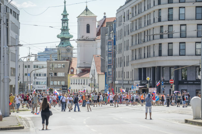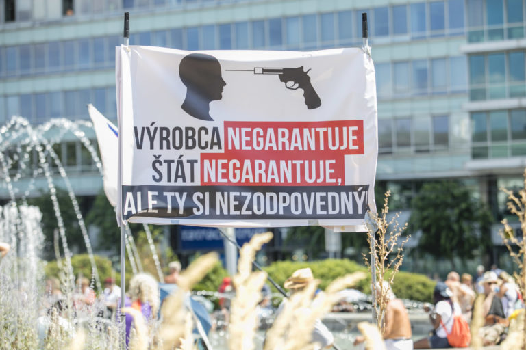 Účastníci počas protestu pred Prezidentským palácom proti novele zákona o verejnom zdraví, ktorá zvýhodňuje zaočkovaných proti ochoreniu COVID-19. Bratislava, 29. júl 2021. Foto: SITA/Jana Birošová