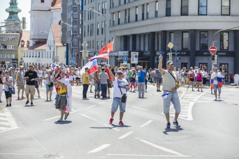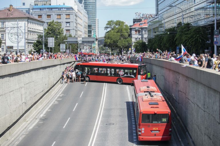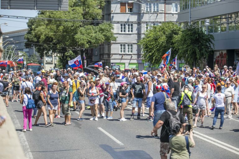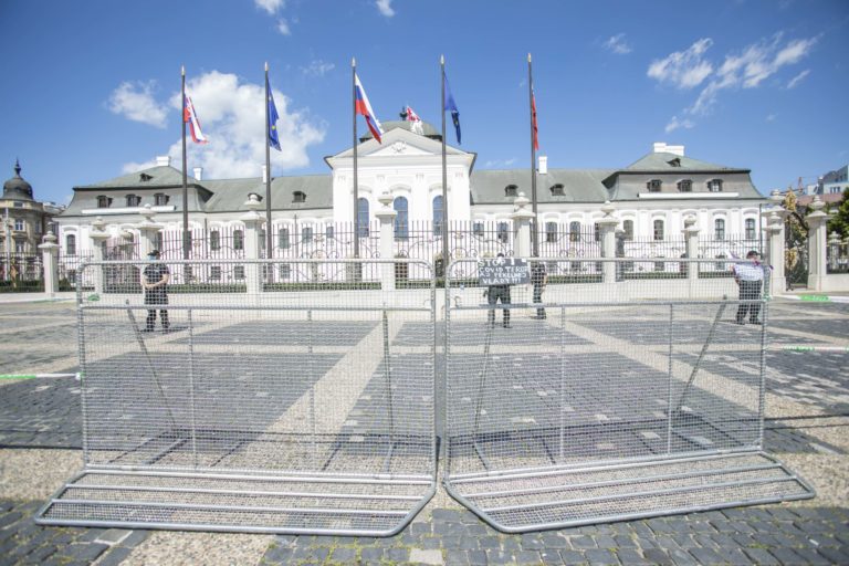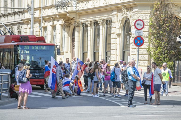 Zátarasy na Hodžovom námestí počas protestu v okolí Prezidentského paláca proti novele zákona o verejnom zdraví, ktorá zvýhodňuje zaočkovaných proti ochoreniu COVID-19. Bratislava, 29. júl 2021. Foto: SITA/Jana Birošová