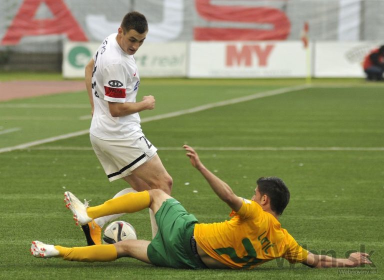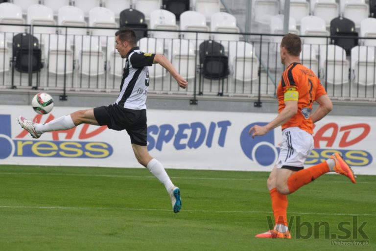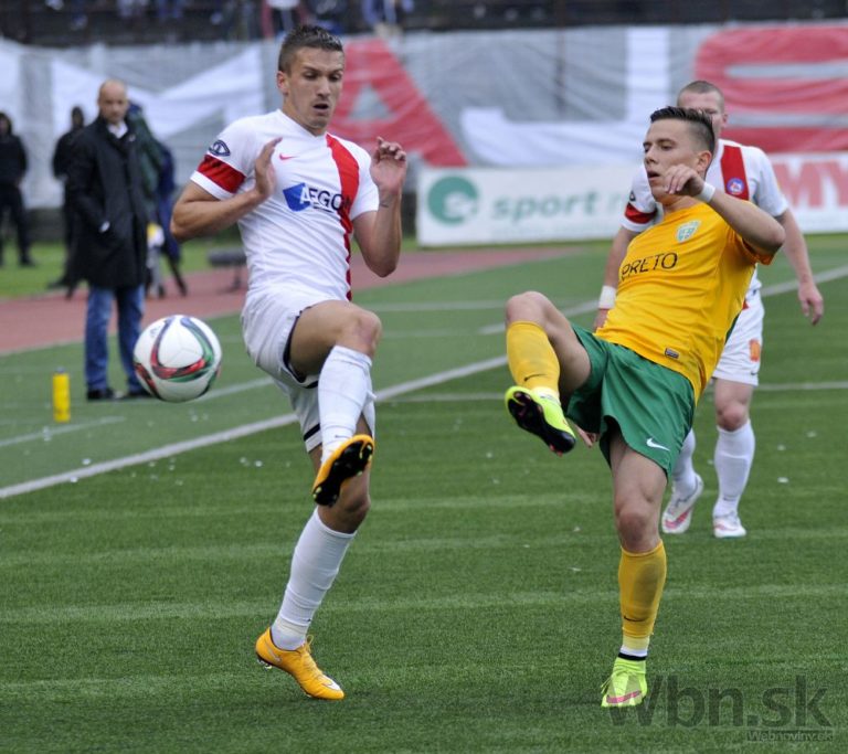 Zľava: Matúš Bero z AS Trenčín a Bojan Letič z MŠK Žilina počas 32. kola jarnej časti Fortuna ligy 2014/2015 v zápase medzi AS Trenčín a MŠK Žilina. Trenčín, 23. máj 2015. Foto: SITA/Tomáš Somr