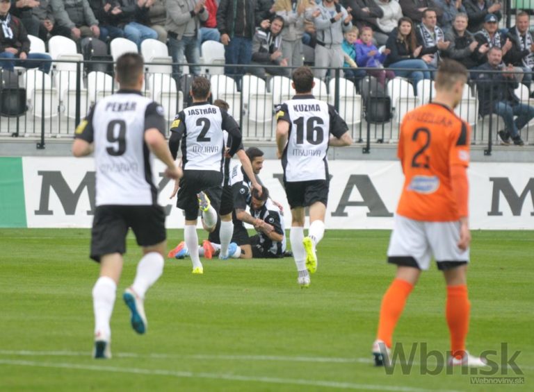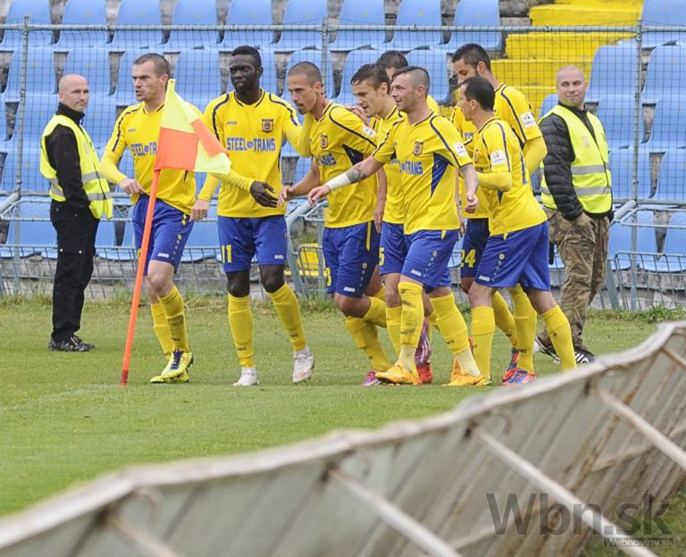 Autor gólu Zoltán Žebík z MFK Košice (v strede) v zápase 32. kola jarnej časti ročníka 2014/15 Fortuna ligy medzi MFK Košice - FK Senica. Košice, 23. máj 2015. Foto: SITA/Jozef Jarošík