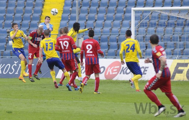 Brankár FK Senica Michal Šulla (tretí zľava vo výskoku) v mele pred bránou v zápase 32. kola jarnej časti ročníka 2014/15 Fortuna ligy medzi MFK Košice - FK Senica. Košice, 23. máj 2015. Foto: SITA/Jozef Jarošík