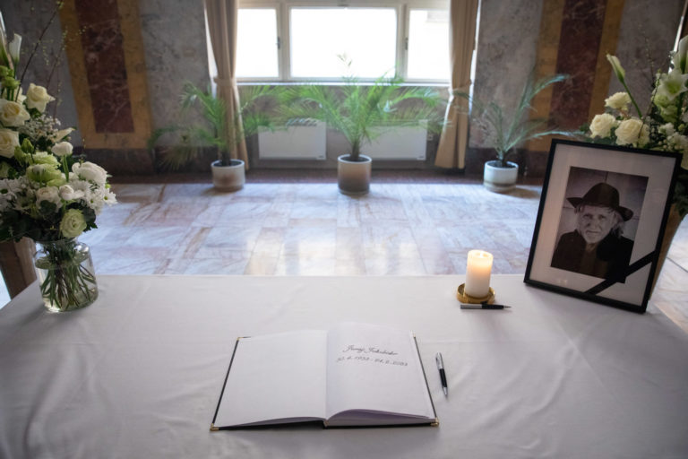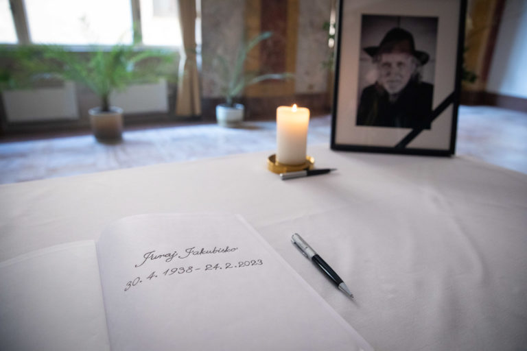 Kondolenčná kniha v Dvorane Ministerstva kultúry SR počas uctenia si pamiatky zosnulého režiséra Juraja Jakubiska. Bratislava, 28. február 2023. Foto: SITA/Diana Černáková