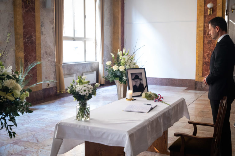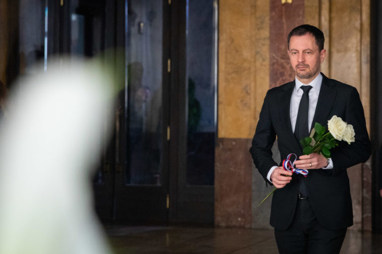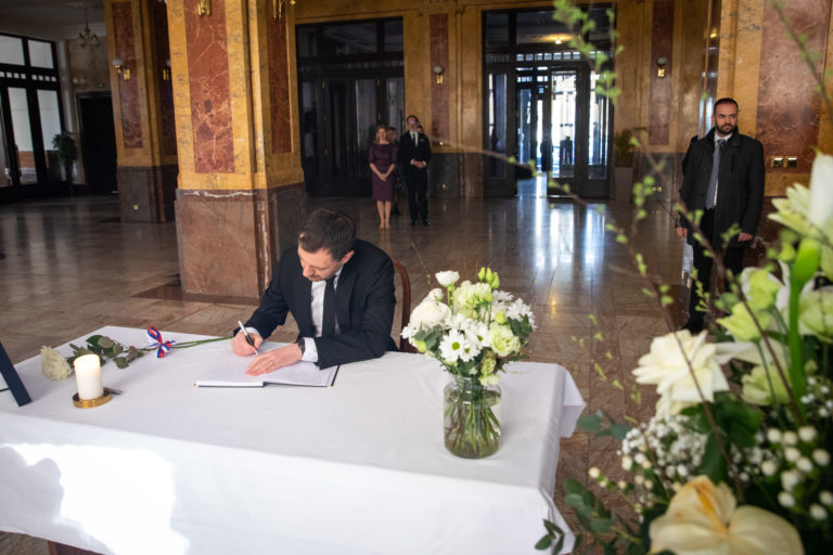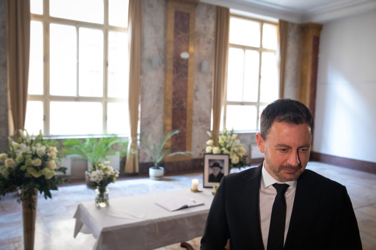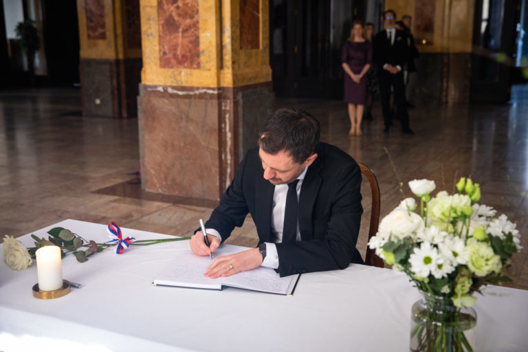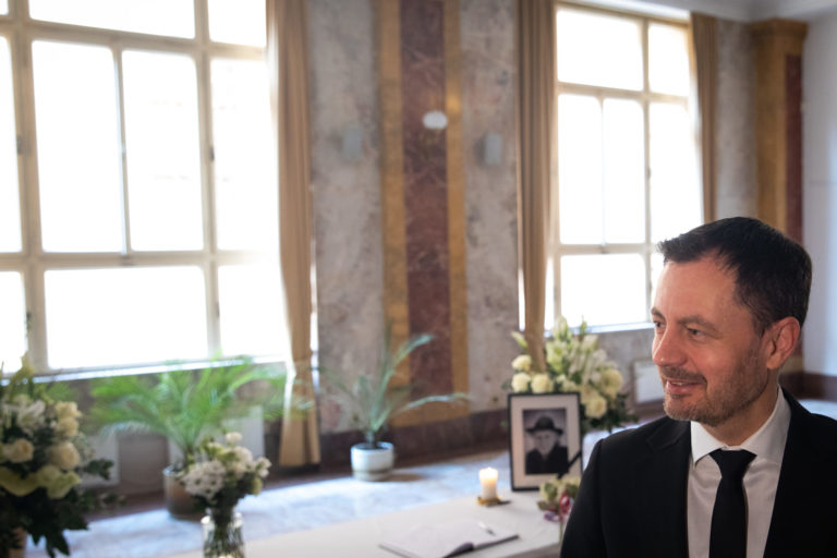 Dočasne poverený predseda vlády SR Eduard Heger počas uctenia si pamiatky zosnulého režiséra Juraja Jakubiska zápisom do kondolenčnej knihy v Dvorane Ministerstva kultúry SR. Bratislava, 28. február 2023. Foto: SITA/Diana Černáková