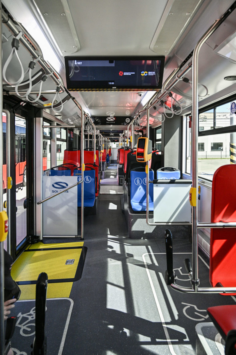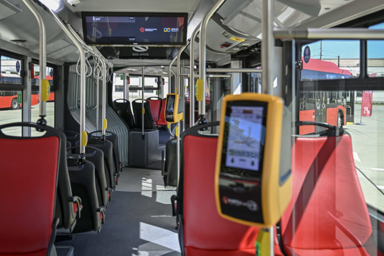 Interiér nového megatrolejbusu počas brífingu hlavného mesta a Dopravného podniku Bratislava (DPB) v Depe Jurajov dvor, na ktorom predstavili rekordné megaterolejbusy. Bratislava, 4. september 2023. Foto: SITA/Milan Illík