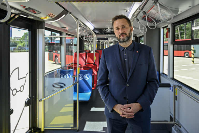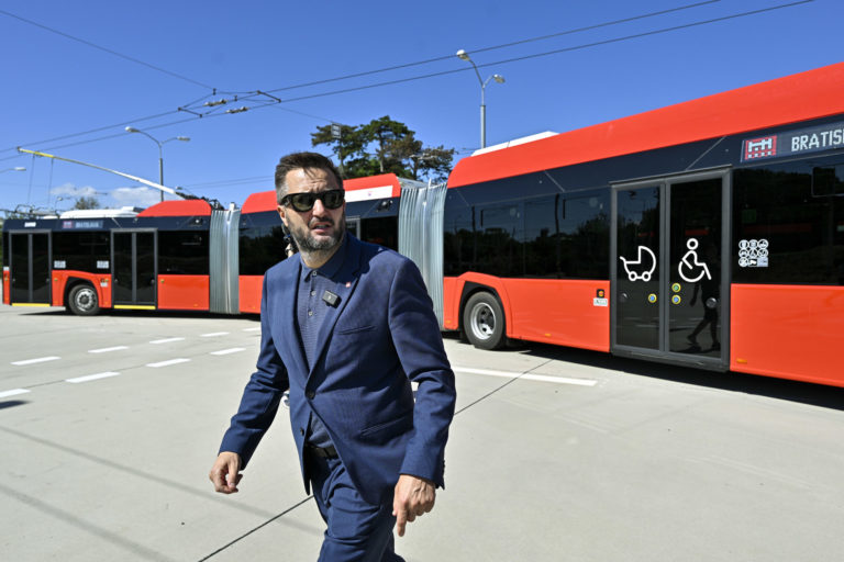 Primátor Bratislavy Matúš Vallo počas brífingu hlavného mesta a Dopravného podniku Bratislava (DPB) v Depe Jurajov dvor, na ktorom predstavili rekordné megaterolejbusy. Bratislava, 4. september 2023. Foto: SITA/Milan Illík