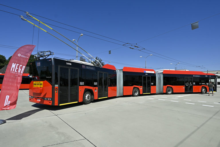 Pohľad na nový megatrolejbus počas brífingu hlavného mesta a Dopravného podniku Bratislava (DPB) v Depe Jurajov dvor, na ktorom predstavili rekordné megaterolejbusy. Bratislava, 4. september 2023. Foto: SITA/Milan Illík