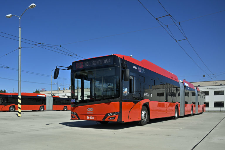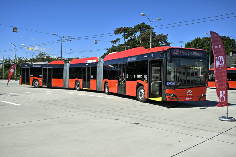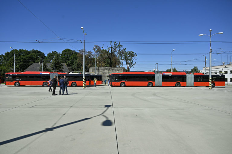 Pohľad na nový megatrolejbus (vľavo) počas brífingu hlavného mesta a Dopravného podniku Bratislava (DPB) v Depe Jurajov dvor, na ktorom predstavili rekordné megaterolejbusy. Bratislava, 4. september 2023. Foto: SITA/Milan Illík