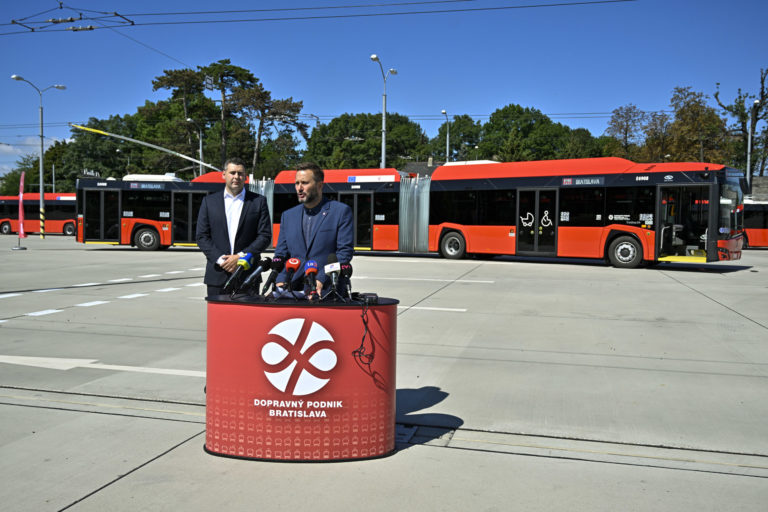 Zľava: Predseda predstavenstva DPB Martin Rybanský a primátor Bratislavy Matúš Vallo počas brífingu hlavného mesta a Dopravného podniku Bratislava (DPB) v Depe Jurajov dvor, na ktorom predstavili rekordné megaterolejbusy. Bratislava, 4. september 2023. Foto: SITA/Milan Illík