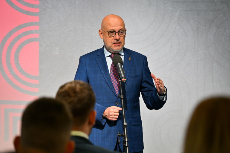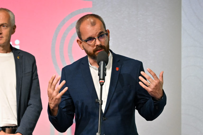 Starosta mestskej časti Bratislava - Nové Mesto Matúš Čupka počas tlačovej konferencie Slovenského olympijského a športového výboru (SOŠV) v rámci predstavenia oficiálnej kolekcie oblečenia slovenskej výpravy pre Hry XXXIII. olympiády v Paríži 2024 a otvorenia Olympijského námestia pred Domom športu. Bratislava, 10. jún 2024. Foto: SITA