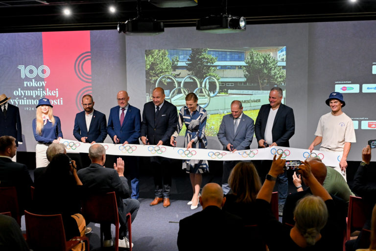 Uprostred zľava: Starosta mestskej časti Bratislava - Nové Mesto Matúš Čupka, prezident Slovenského olympijského a športového výboru (SOŠV) Anton Siekel, minister pre šport a cestovný ruch Dušan Keketi, slovenská olympionička Anastasia Kuzminová, štátny tajomník pre šport a cestovný ruch Ján Krišanda a predseda Bratislavského samosprávneho kraja Juraj Droba symbolicky prestrihávajú pásku počas tlačovej konferencie Slovenského olympijského a športového výboru (SOŠV) v rámci predstavenia oficiálnej kolekcie oblečenia slovenskej výpravy pre Hry XXXIII. olympiády v Paríži 2024 a otvorenia Olympijského námestia pred Domom športu. Bratislava, 10. jún 2024. Foto: SITA