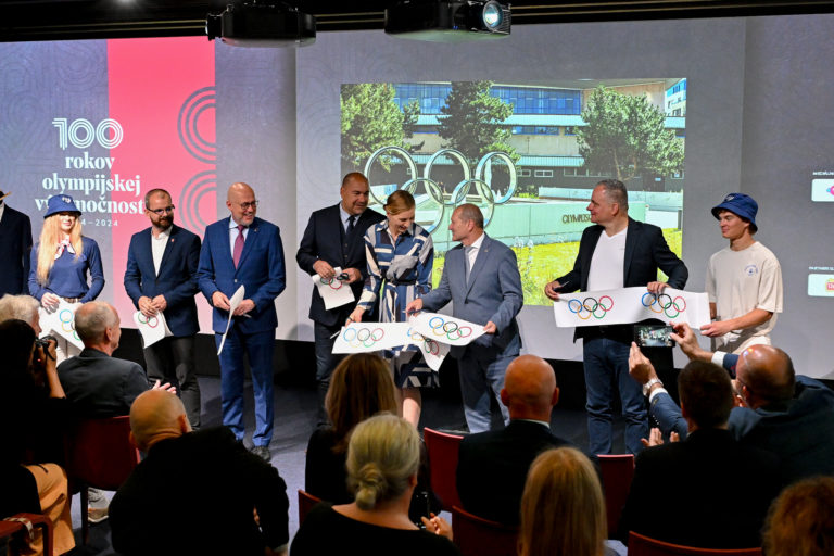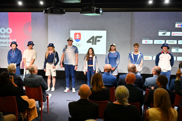 Predstavenie oficiálnej kolekcie oblečenia slovenskej výpravy pre Hry XXXIII. olympiády v Paríži 2024 počas tlačovej konferencie Slovenského olympijského a športového výboru (SOŠV), v rámci ktorej otvorili Olympijské námestie pred Domom športu. Bratislava, 10. jún 2024. Foto: SITA