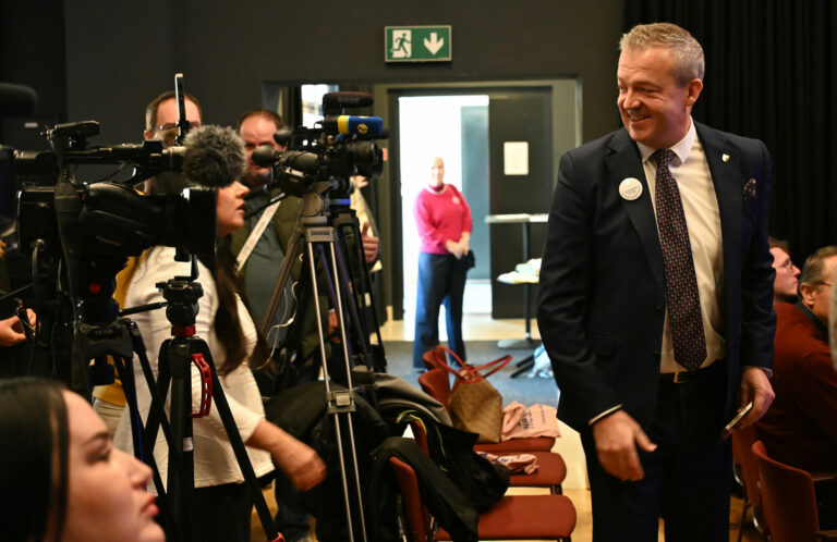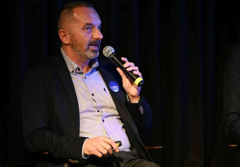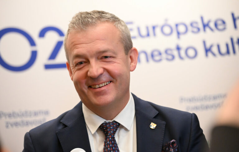 Predseda Trenčianskeho samosprávneho kraja Jaroslav Baška počas tlačovej konferencie pri predstavení programu Európskeho hlavného mesta kultúry Trenčín 2026 v priestoroch kultúrno-kreatívneho centra Hviezda v Trenčíne. Trenčín, 8. november 2024. Foto: SITA/Tomáš Somr