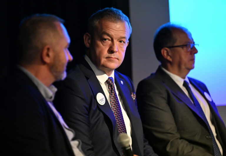Zľava: Riaditeľ Trenčín EHMK 2026 Ján Sudzina, predseda Trenčianskeho samosprávneho kraja Jaroslav Baška a primátor mesta Trenčín Richard Rybníček, počas tlačovej konferencie pri predstavení programu Európskeho hlavného mesta kultúry (EHMK) Trenčín 2026 v priestoroch kultúrno-kreatívneho centra Hviezda v Trenčíne. Trenčín, 8. november 2024. Foto: SITA/Tomáš Somr