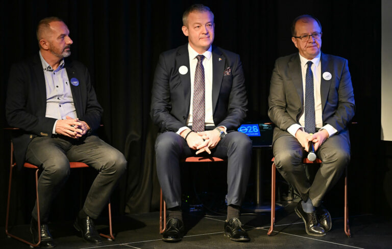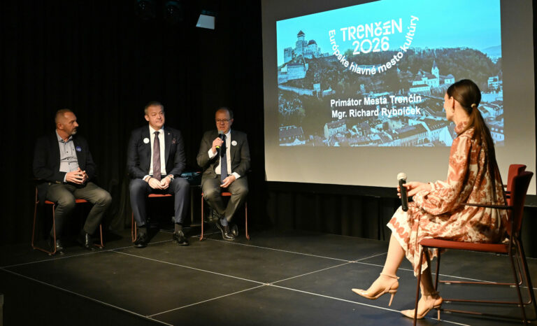 Zľava: Riaditeľ Trenčín EHMK 2026 Ján Sudzina, predseda Trenčianskeho samosprávneho kraja Jaroslav Baška a primátor mesta Trenčín Richard Rybníček počas tlačovej konferencie pri predstavení programu Európskeho hlavného mesta kultúry Trenčín 2026 v priestoroch kultúrno-kreatívneho centra Hviezda v Trenčíne. Trenčín, 8. november 2024. Foto: SITA/Tomáš Somr