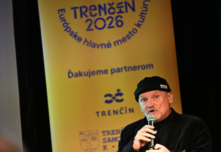 Riaditeľ Trenčín EHMK 2026 Ján Sudzina (vpravo) počas tlačovej konferencie pri predstavení programu Európskeho hlavného mesta kultúry (EHMK) Trenčín 2026 v priestoroch kultúrno-kreatívneho centra Hviezda v Trenčíne. Trenčín, 8. november 2024. Foto: SITA/Tomáš Somr