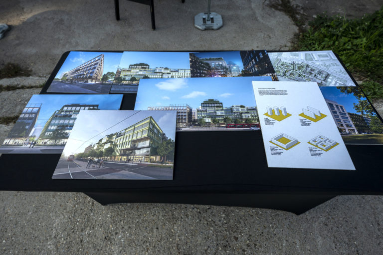 Vizualizácie konceptu Novej Palmy počas predstavenia v rámci revitalizácie areálu bývalého závodu Palma. Bratislava, 3. október 2023. Foto: SITA/Milan Illík