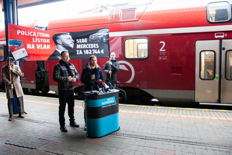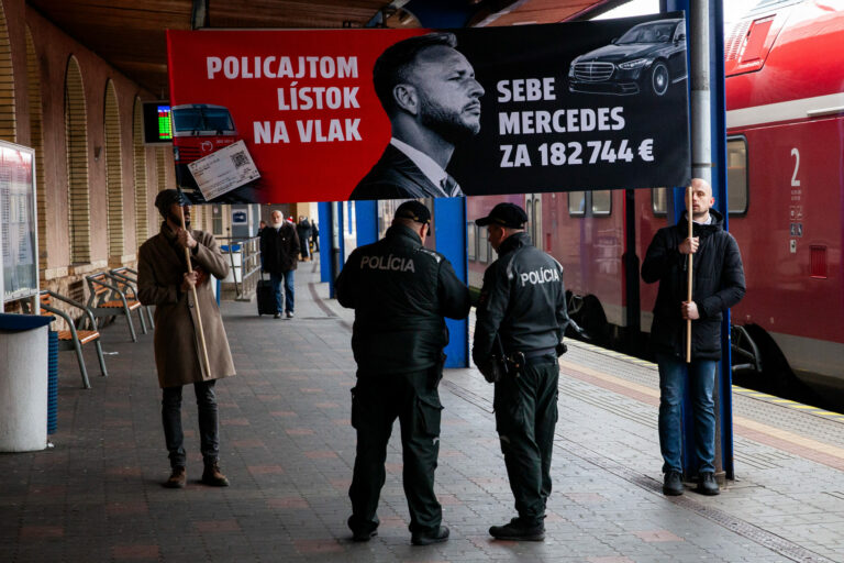 Protestný banner hnutia Slovensko v priestoroch Hlavnej železničnej stanice v Bratislave pri príležitosti ohlásenia spolupráce MVSR so ZSSK a výhod pre Policajný zbor SR v podobe ročného cestovania vlakmi 2. triedy za symbolický príspevok. Bratislava, 13. december 2024. Foto: SITA/Tomáš Bokor