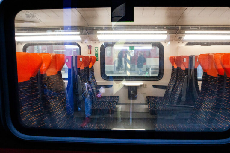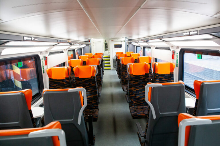 Interiér vlaku 2. triedy v priestoroch Hlavnej železničnej stanice v Bratislave pri príležitosti ohlásenia spolupráce Ministerstva vnútra SR so Železničnej spoločnosti Slovensko (ZSSK) a výhod pre Policajný zbor SR v podobe ročného cestovania vlakmi 2. triedy za symbolický príspevok. Bratislava, 13. december 2024. Foto: SITA/Tomáš Bokor