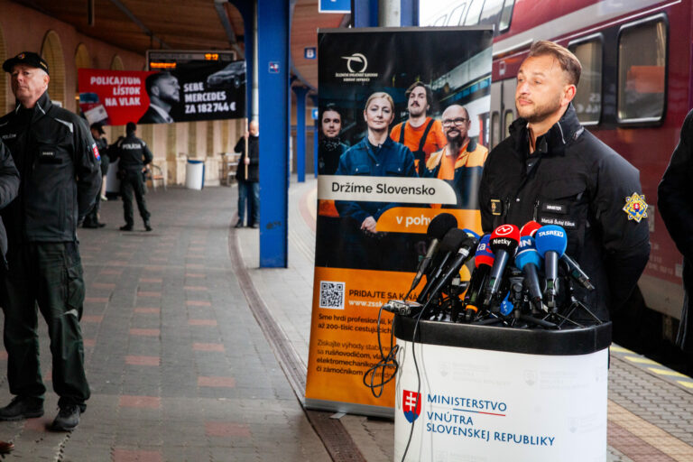 Minister vnútra Matúš Šutaj Eštok (vpravo) a protestný banner hnutia Slovensko (vľavo v pozadí) počas tlačovej konferencie Železničnej spoločnosti Slovensko (ZSSK) v priestoroch Hlavnej železničnej stanice v Bratislave pri príležitosti ohlásenia spolupráce so ZSSK a výhod pre Policajný zbor SR v podobe ročného cestovania vlakmi 2. triedy za symbolický príspevok. Bratislava, 13. december 2024. Foto: SITA/Tomáš Bokor