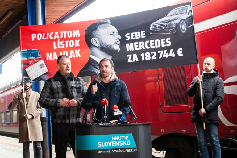 Sprava: Predseda predstavenstva, generálny riaditeľ ZSSK Peter Helexa, minister vnútra Matúš Šutaj Eštok a protestný banner hnutia Slovensko (v pozadí vľavo) počas tlačovej konferencie Železničnej spoločnosti Slovensko (ZSSK) v priestoroch Hlavnej železničnej stanice v Bratislave pri príležitosti ohlásenia spolupráce so ZSSK a výhod pre Policajný zbor SR v podobe ročného cestovania vlakmi 2. triedy za symbolický príspevok. Bratislava, 13. december 2024. Foto: archívne, SITA/Tomáš Bokor