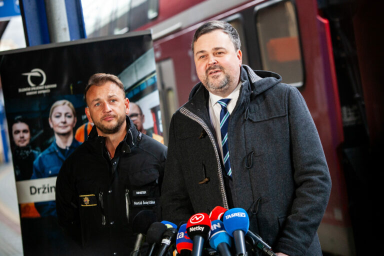 Zľava: Minister vnútra Matúš Šutaj Eštok a predseda predstavenstva a generálny riaditeľ ZSSK Peter Helexa počas tlačovej konferencie Železničnej spoločnosti Slovensko (ZSSK) v priestoroch Hlavnej železničnej stanice v Bratislave pri príležitosti ohlásenia spolupráce so ZSSK a výhod pre Policajný zbor SR v podobe ročného cestovania vlakmi 2. triedy za symbolický príspevok. Bratislava, 13. december 2024. Foto: SITA/Tomáš Bokor