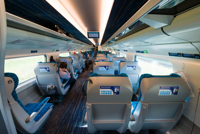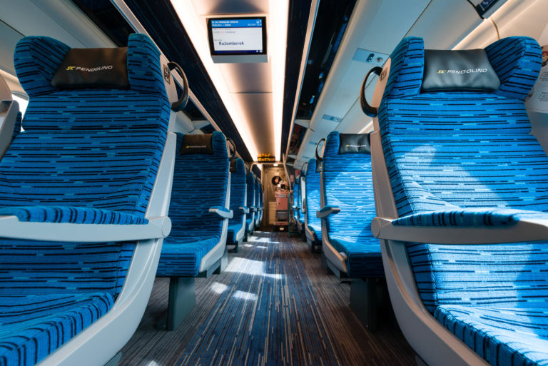 Interiér vozňov súpravy modernizovaného vlaku SC 241 Pendolino Košičan. Žilina, 25. september 2017. Foto: SITA/Milo Fabian
