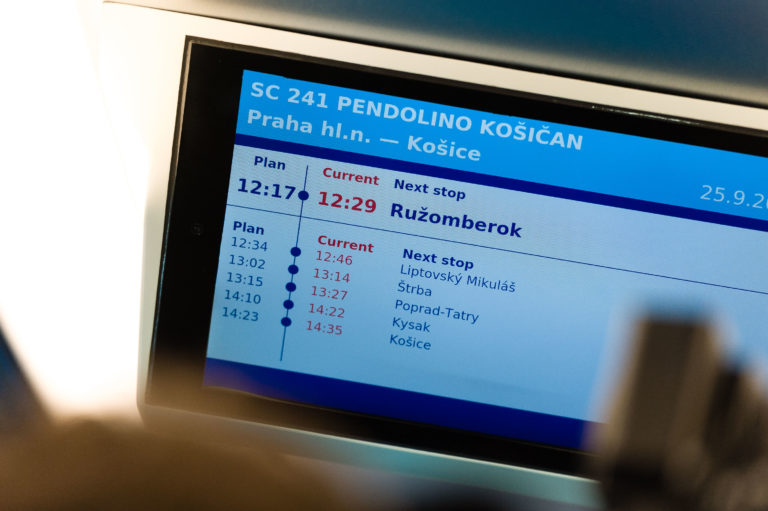 Informačná tabuľa v prvej modernizovanej jednotke vo vlaku SC 241 Pendolino Košičan. Žilina, 25. september 2017. Foto: SITA/Milo Fabian