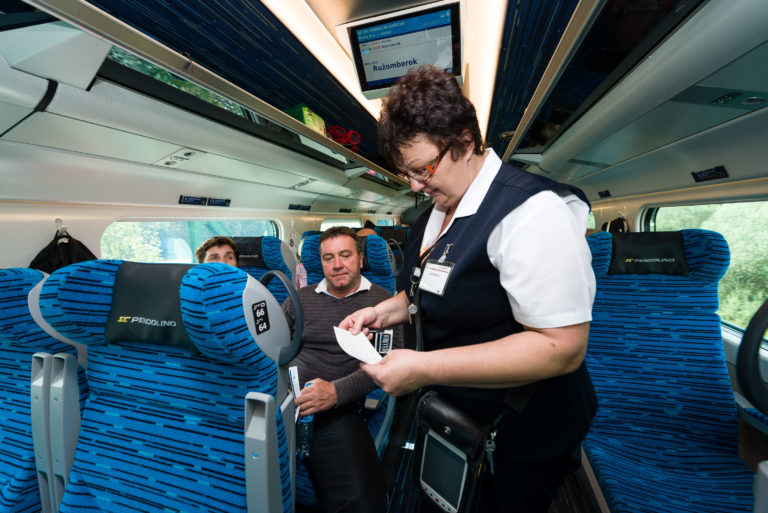 Vlakvedúca pri kontrole cestovných lístkov v prvej modernizovanej jednotke vo vlaku SC 241 Pendolino Košičan. Žilina, 25. september 2017. Foto: SITA/Milo Fabian